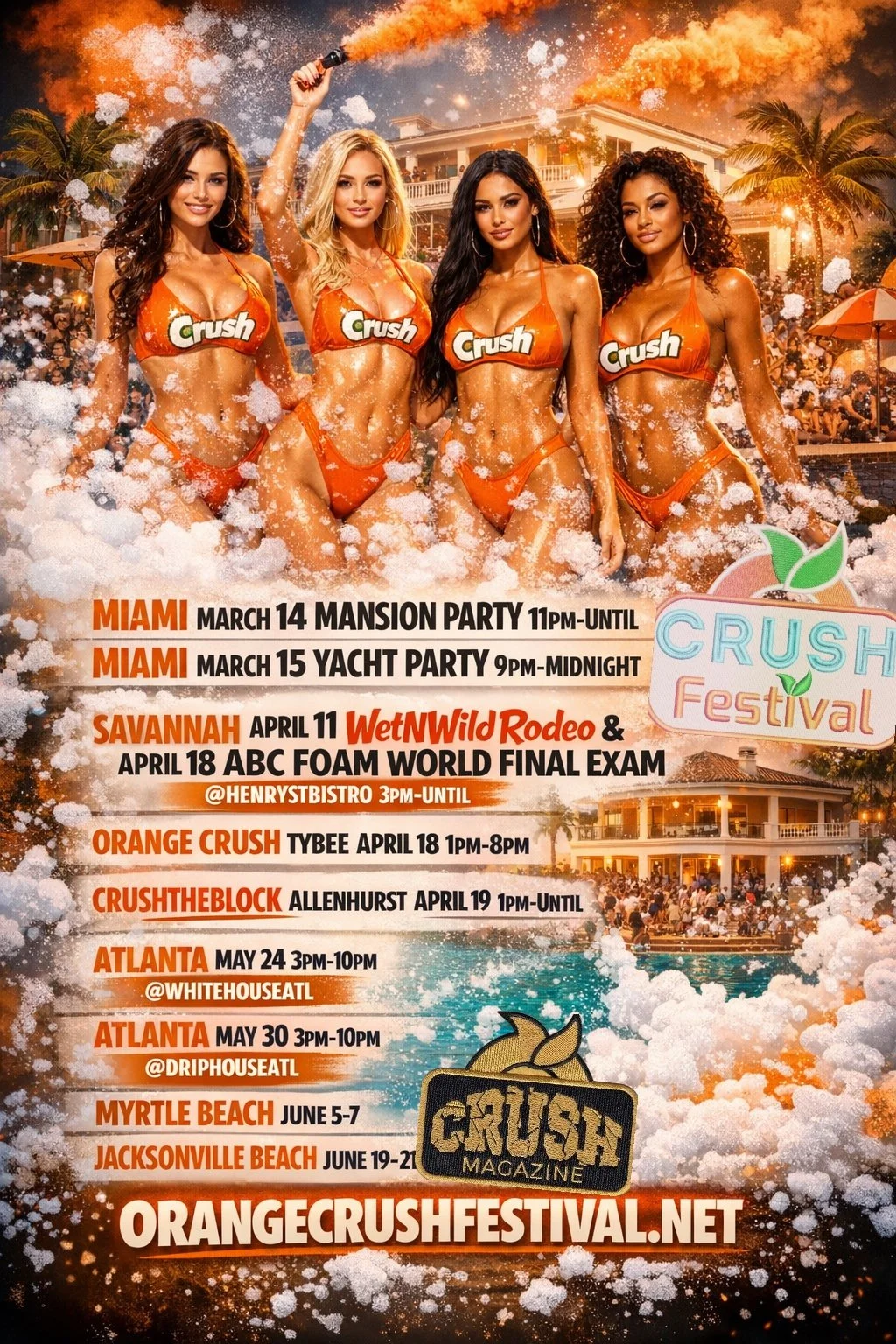 The 2026 tour begins during Miami Spring Break, where Orange Crush brings its signature nightlife energy to South Beach.