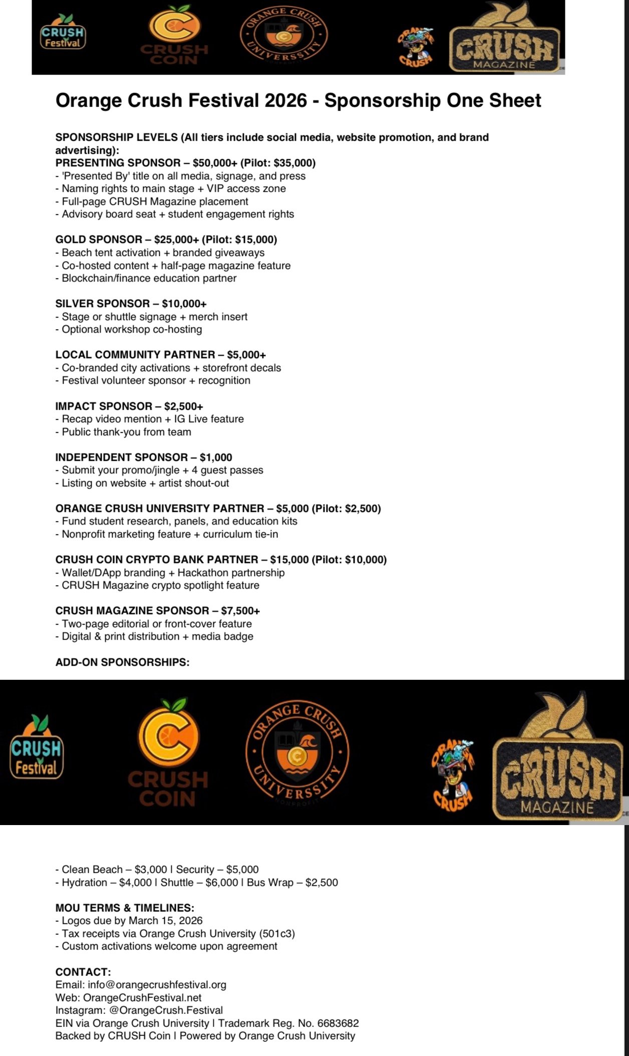 Welcome to the official sponsorship and donor partnership deck for the Orange Crush Festival. As a federally registered trademark, veteran-owned business, and multi-state cultural event series, we invite you to join a legacy of empowerment, youth engagement, and innovation.