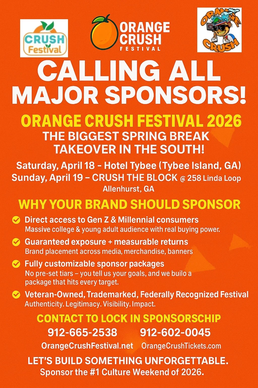 Orange Crush Festival is a veteran-led, community-centered cultural movement spanning Georgia, Alabama, and beyond. With Spring Break activations, music stages, and university engagement from Savannah State to CAU, we offer a dynamic platform for brand exposure, youth impact, and social change.