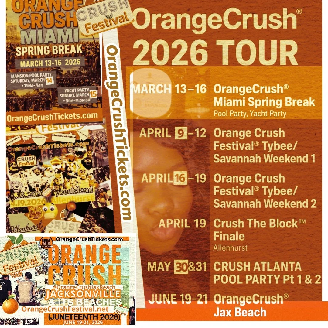 ORANGE CRUSH FESTIVAL Tybee Island 2025 HEADLINE PERFORMERS We Support Savannah DA SOUF GOT SUMN 2 SAY 2026 OFFICIAL ORANGE CRUSH LINEUP